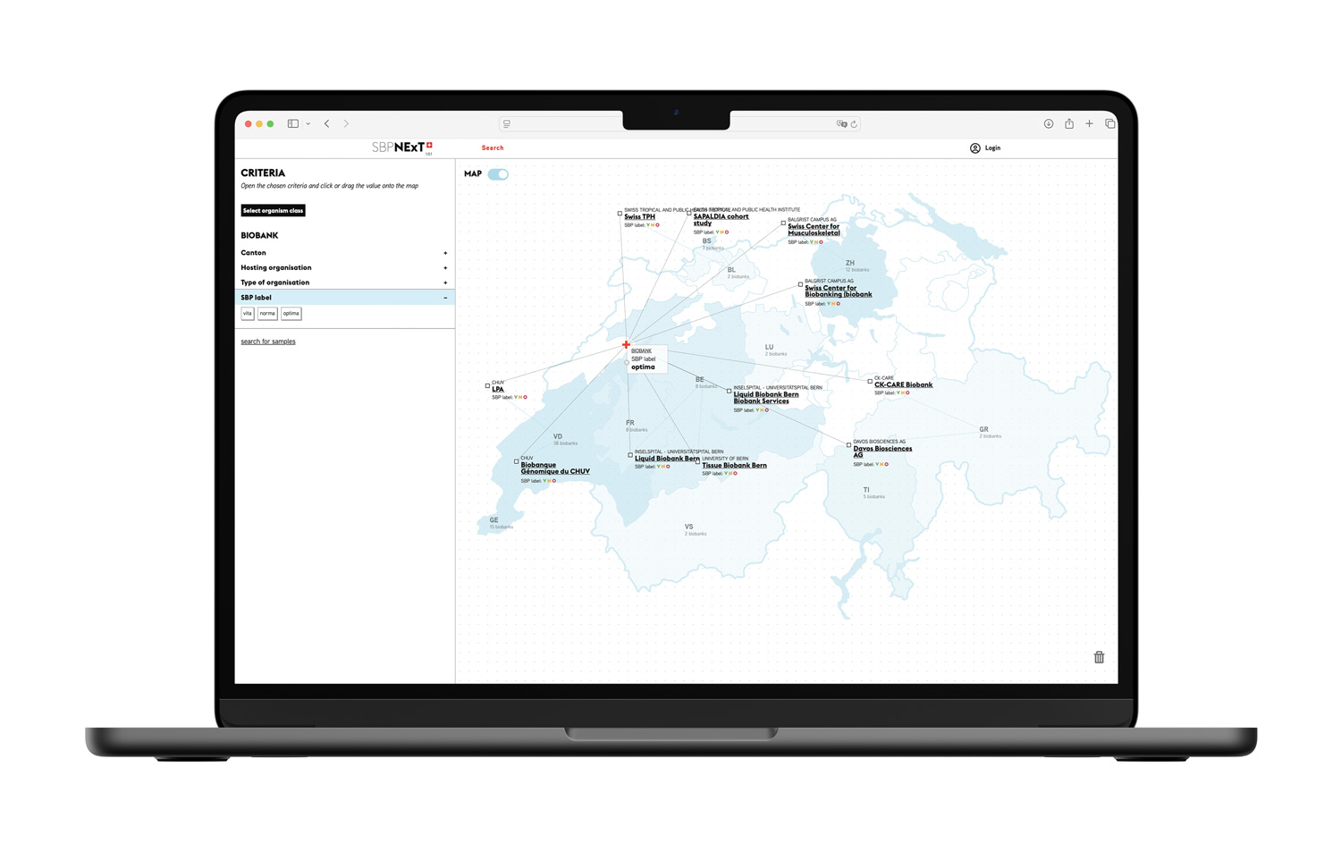 Enhancing visibility and accelerating collaboration in Swiss biobanking. Too many samples remain unused in biobanks because they are not shared or promoted. To address this, we developed NExT (Network Exploration Tool), the first national e-catalogue, an intuitive and visual platform for exploring the Swiss Biobank Network.